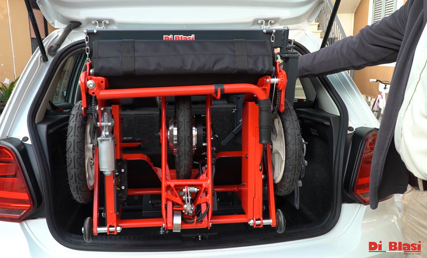 The DI BLASI mod.R30.2 mobility scooter folds automatically at the touch of a button. When folded , it is the size of a suitcase and can therefore be easily transported in the trunk of cars, campers, carried as baggage on the plane, carried in the elevator, stored in a corner of the house. It can be dragged on its service wheels, like a trolley.