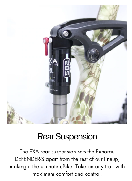 The EXA rear suspension sets the Eunorau DEFENDER-S apart from the rest of our lineup, making it the ultimate eBike. Take on any trail with maximum comfort and control.