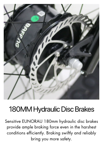 Sensitive EUNORAU 180mm hydraulic disc brakes provide ample braking force even in the harshest conditions efficiently. Braking swiftly and reliably bring you more safety.