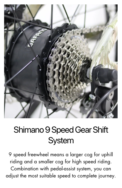 9 speed freewheel means a larger cog for uphill riding and a smaller cog for high speed riding. Combination with pedal-assist system, you can adjust the most suitable speed to complete journey.