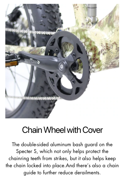 The double-sided aluminum bash guard on the Specter S, which not only helps protect the chainring teeth from strikes, but it also helps keep the chain locked into place.And there’s also a chain guide to further reduce derailments.