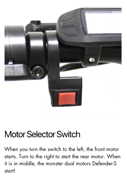 When you turn the switch to the left, the front motor starts. Turn to the right to start the rear motor. When it is in middle, the monster dual motors Defender-S start!