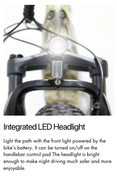 Light the path with the front light powered by the bike's battery. It can be turned on/off on the handlebar control pad.The headlight is bright enough to make night driving much safer and more enjoyable.
