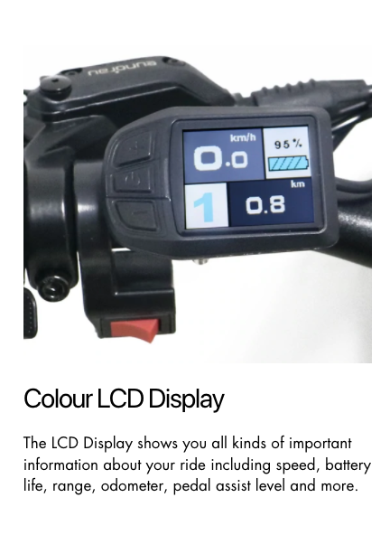The LCD Display shows you all kinds of important information about your ride including speed, battery life, range, odometer, pedal assist level and more.