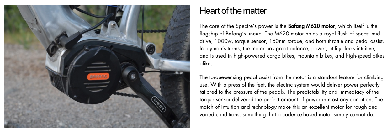 The core of the Spectre’s power is the Bafang M620 motor, which itself is the flagship of Bafang’s lineup. The M620 motor holds a royal flush of specs: mid-drive, 1000w, torque sensor, 160nm torque, and both throttle and pedal assist. In layman’s terms, the motor has great balance, power, utility, feels intuitive, and is used in high-powered cargo bikes, mountain bikes, and high-speed bikes alike.