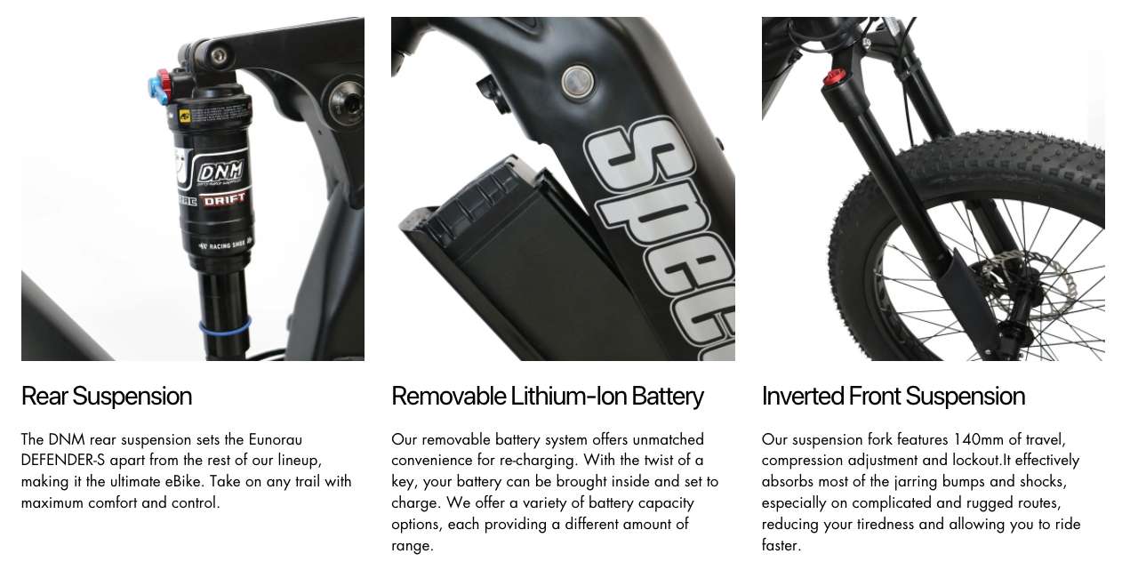 The DNM rear suspension sets the Eunorau DEFENDER-S apart from the rest of our lineup, making it the ultimate eBike. Take on any trail with maximum comfort and control.