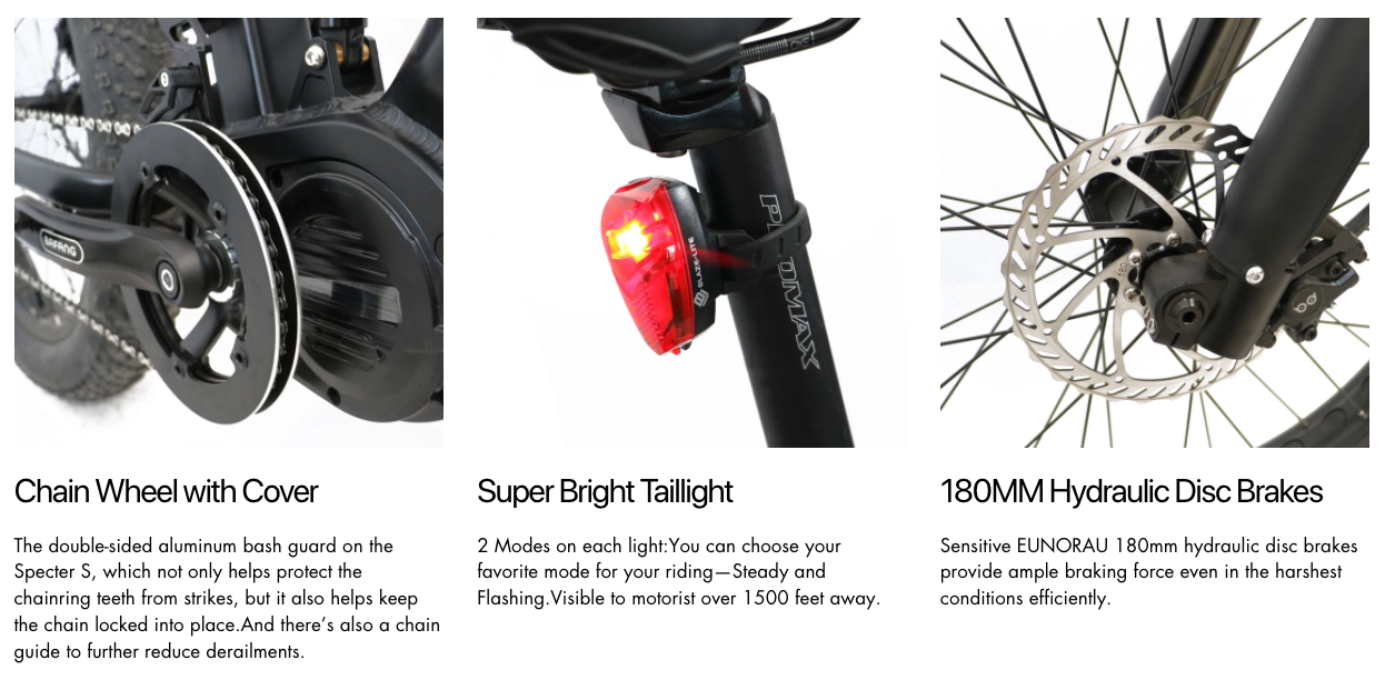 The double-sided aluminum bash guard on the Specter S, which not only helps protect the chainring teeth from strikes, but it also helps keep the chain locked into place.And there’s also a chain guide to further reduce derailments.